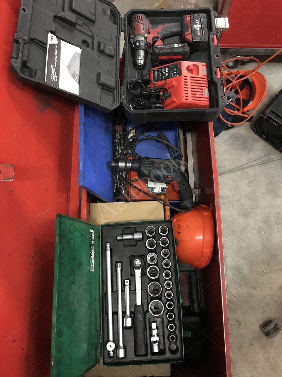 Contenente: n.1 caschetto Kapriol, Piede di porco, n.1 set chiavi inglesi intercambiabili marca pastorino, imbragatura di sicurezza, bolla, saldatore elettrico Ersa, pistola termica marca Steinhel mod hl1610s, attrezzi vari e punte, n.13 chiavi inglesi, trapano marca bosch, avvitatore milwaukee mod. m18 con caricabatterie e due batterie, mola marca bosch mod. gws 88-115 completo di dischi